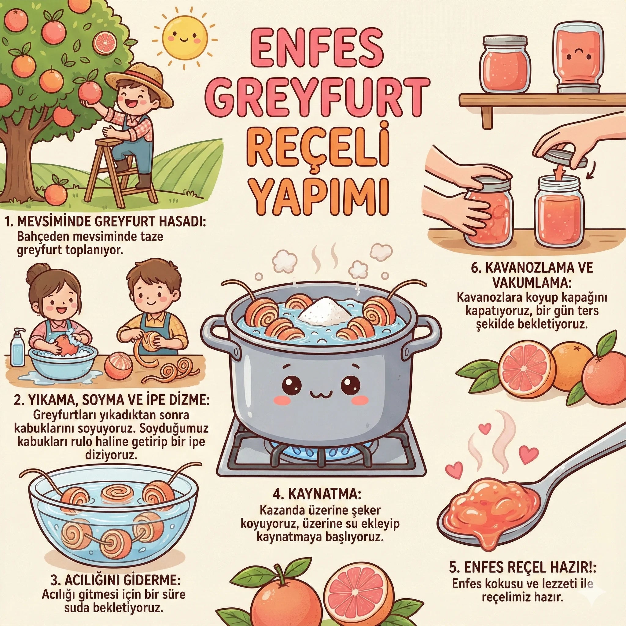 Reçelimiz, mevsiminde dalından toplanan en taze greyfurtlar tek tek seçilerek geleneksel usulle hazırlanır. Koruyucu, boya ve katkı maddesi içermez.