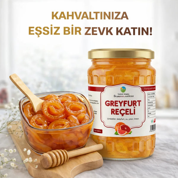 Reçelimiz, mevsiminde dalından toplanan en taze greyfurtlar tek tek seçilerek geleneksel usulle hazırlanır. Koruyucu, boya ve katkı maddesi içermez.