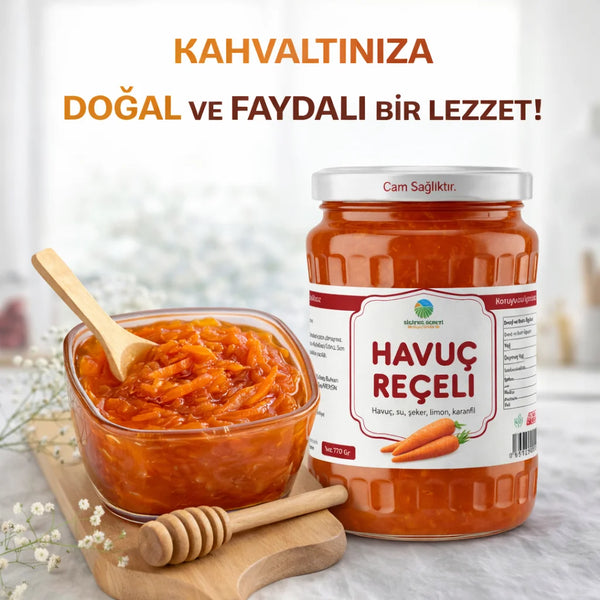 Havuç Reçelinin kavanozunun kapağını açtığınızda meyvenin kokusunu alacağınız tamamen doğal, geleneksel yöntemlerle üretilmiştir. Havuç Reçeli doğal olması sebebiyle oldukça sağlıklıdır.
