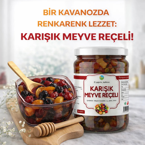 Ev yapımı karışık meyve reçeli; birden fazla meyvenin aromasını tek kavanozda buluşturan, geleneksel pişirme yöntemiyle hazırlanmış reçel çeşididir.