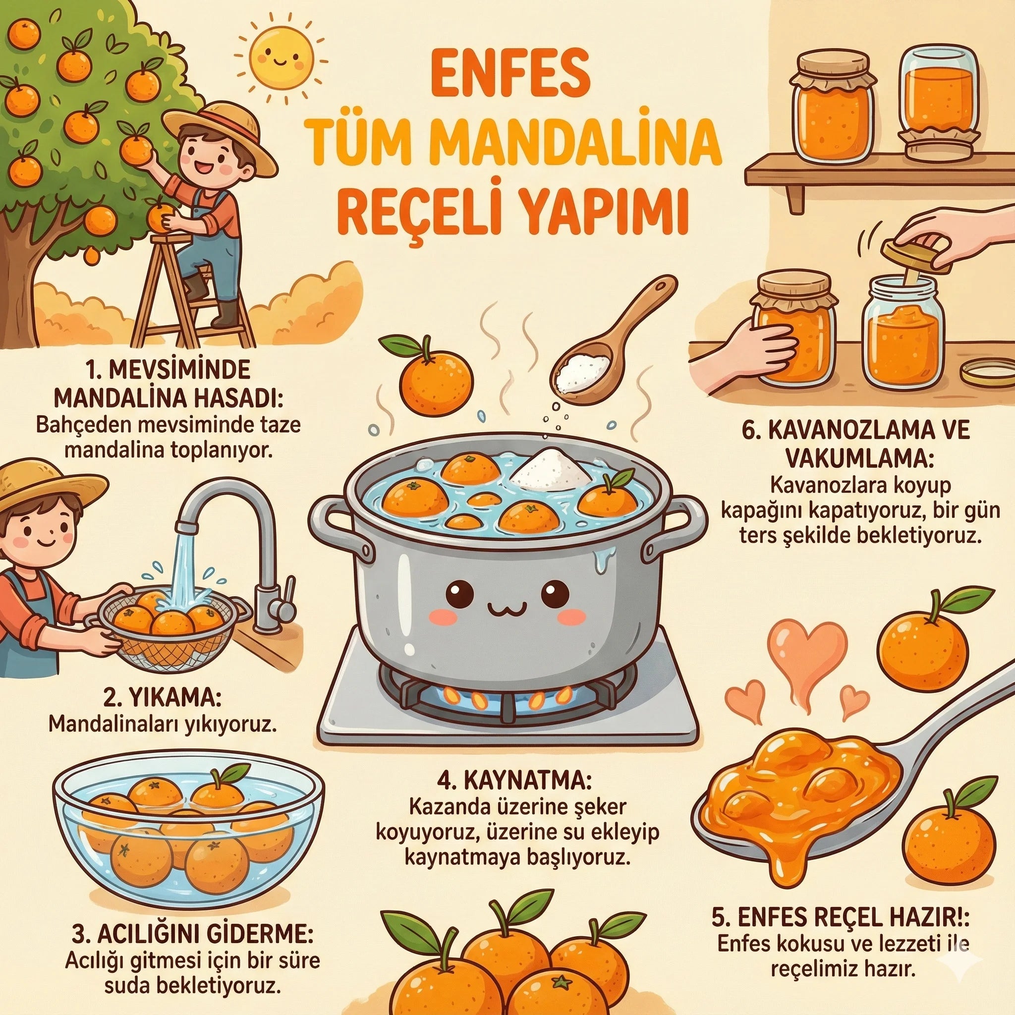 Taze mandalinalar özenle seçilir ve geleneksel tariflere sadık kalınarak hazırlanır. Üretim sürecinde kimyasal katkı kullanılmadan, mandalinanın aroması korunacak şekilde pişirilir.